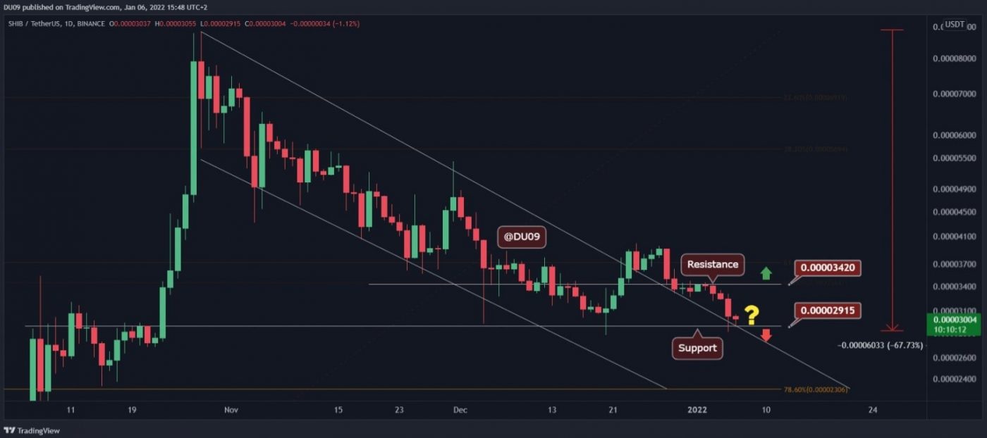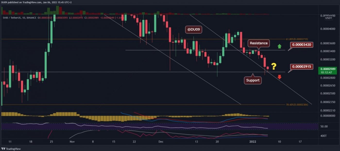 Có một tín hiệu tốt trong đợt giảm giá mới nhất này đó là SHIB đã không tạo một đáy thấp hơn so với mức thấp ngày 20 tháng 12. Vì lý do này, nếu SHIB giữ trên mức hỗ trợ hiện tại là 0.000029 USD, thì nó sẽ có cơ hội củng cố quanh mức hiện tại. Mức kháng hiện tại là 0.000034 USD.